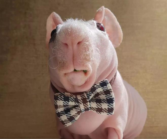 正如其名,是身上光秃秃、像小猪般的天竺鼠。只有鼻头和脚上有一点毛发。因为被毛少,不耐冷热温差,一整年都必须进行温度管理。此外,皮肤病的预防也是不可欠缺的。